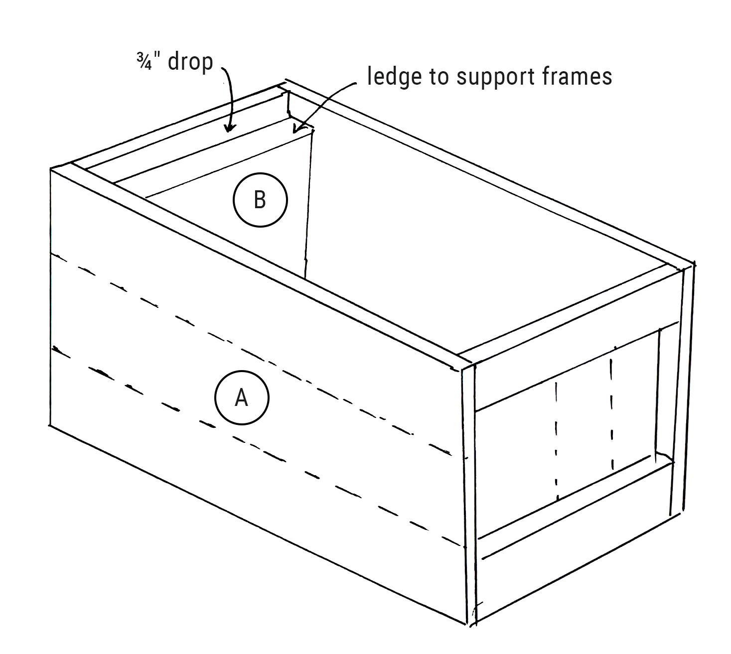 This consists of two 4-inch boards cut to 19 ⅛ inches on either side of a 5-inch board cut to 16 inches as shown in the sketch. They are held in place by two 4-inch ‘feet’ cut to 13 inches. The boxes overhang the floor by ¼ inch on either side.